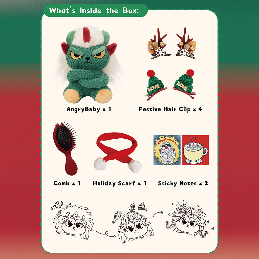 Mix and match the included scarf, hair clips, and comb to style AngryBaby in your favorite holiday look.